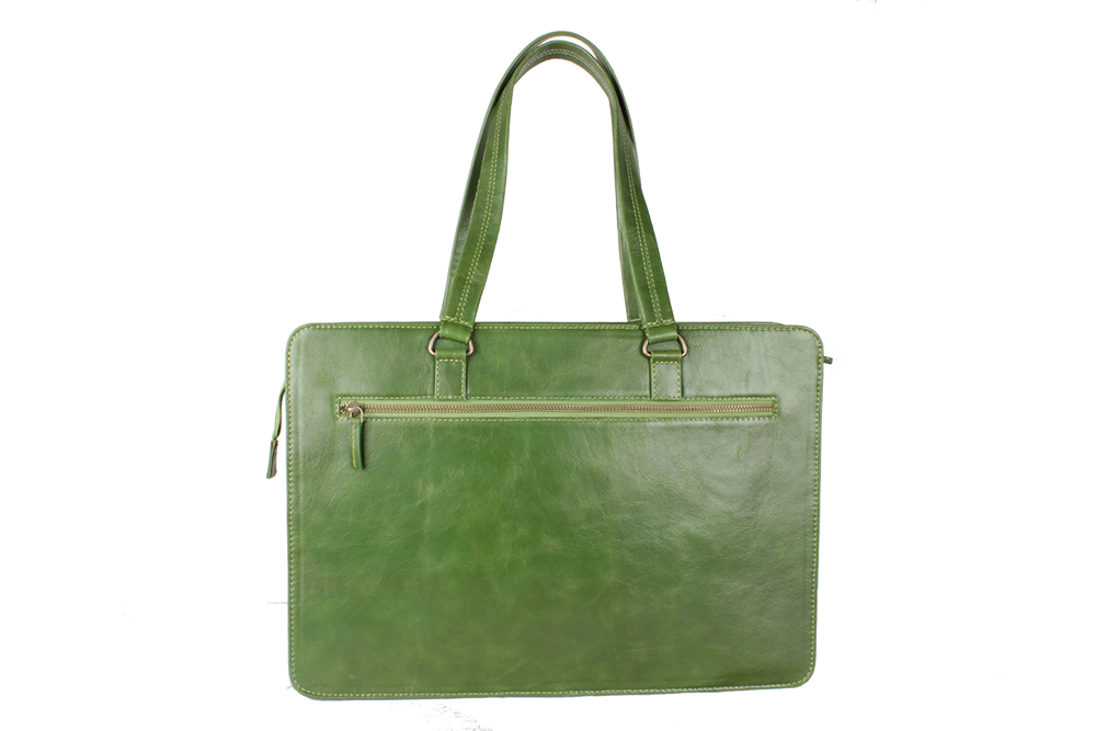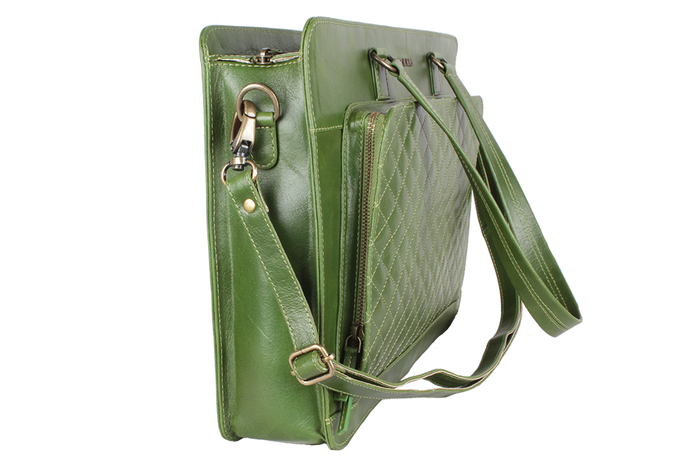 Made from Genuine, Natural Grain Buff leather. Carry your laptop in style. It can accommodate up to 15'' laptop. It features a zip closure, 2 shoulder straps and 1 shoulder adjustable strap. In front there is utility section to keep your phone, pens, earphones, keys, specs and documents secure. It comes with a roomy compartment, other sections. This is a perfect bag for a working women.